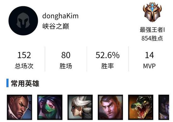 目前Doran的rank分是最强王者936点,总成绩是74胜56负,胜率56.9%。常用英雄分别是:杰斯,青钢影,剑姬,卢锡安,女刀锋,塞拉斯。