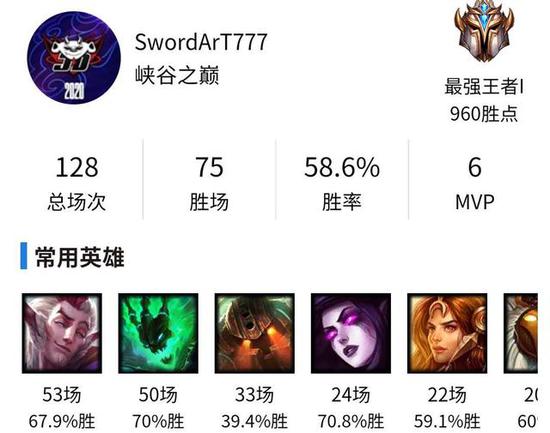 目前蛇蛇的rank分是最强王者960点,总成绩是75胜53负,胜率58.6%。常用英雄分别是:洛,锤石,泰坦,莫甘娜,曙光,巴德,派克,塔姆。