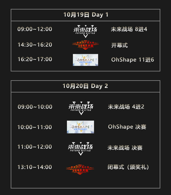 决赛第一场8进4(淘汰制)BO5每局7分钟;第二场4进2,分A.B组进行组内循环,(积分制)BO1 每局7分钟;冠亚军决赛“最后的决战”(比赛总时间1小时),2进1 PK争夺冠军,BO5 每局7分钟。