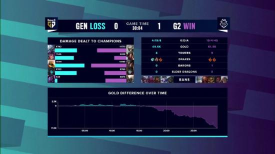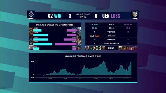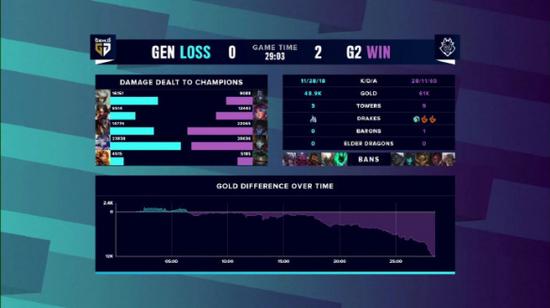 31分钟,双方中路爆发团战GEN狗熊想要独自一人切入后排,但G2洛直接配合队友将其击杀,随后展开追击在击杀GEN最后一人后一波结束了比赛,恭喜G2获胜!