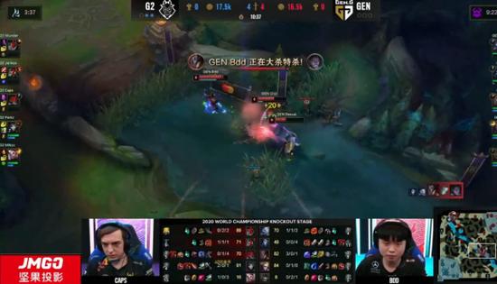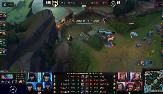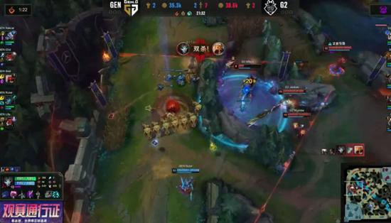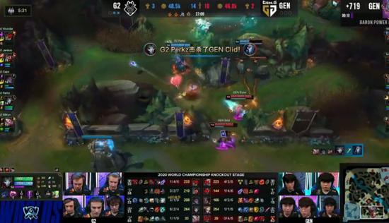 前期G2中路塞拉斯通过游走帮助下路建立起优势,经济一度领衔GEN 3千。10分钟,双方下路爆发团战,GEN卡牌配合队友击杀鳄鱼狗熊大招留下男枪,卡牌跟上伤害将其击杀狗熊残血逃生,仅存的塞拉斯也难逃一死GEN打出一波0换3。