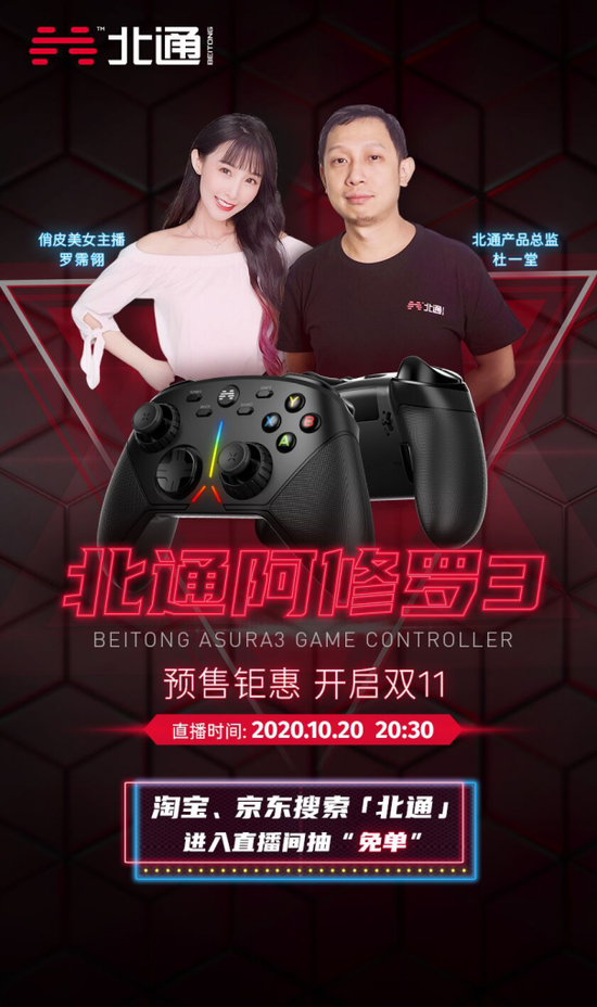 此外,20:30淘宝、京东电商平台将有北通产品总监——杜一堂、俏皮美女主播——罗霈翎与粉丝在线互动,解答玩家对北通阿修罗3游戏手柄的疑问。