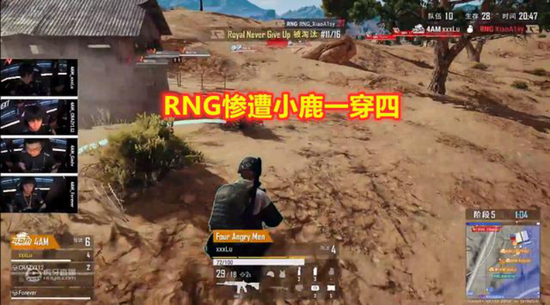 第一次的一穿四是在第四场与RNG的战斗,当时韦神率先惨遭淘汰,永远与112又与小鹿的距离太远,在面对RNG四人的强势来袭下,小鹿在小山坡的掩体下不断上下切枪移动,在精准的枪法与手雷的不断轰炸下,RNG战队惨遭小鹿一穿四,唯一美中不足的是,其中RNG倒地的一名选手遭到了MQ战队的K头。