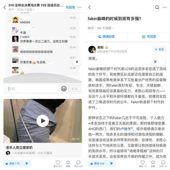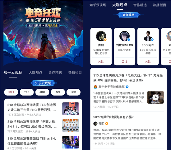 “S10全球总决赛淘汰赛TES创造历史让二追三击败FNC晋级四强,如何评价这场比赛?”“S10全球总决赛四强战TES vs SN,你觉得谁能晋级决赛?”在知乎,聚集大量电竞粉丝讨论赛事热点。同时,在“电竞狂欢聚焦S10全球总决赛”专题下,“知乎云现场”“大咖观点”“视频活动”等六大板块为粉丝多角度剖析这场电竞盛宴。