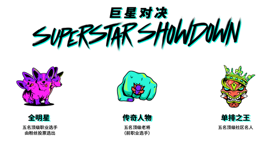 全明星赛改为线上后,职业选手和社区名人都将从各自的家中或赛区主场参加比赛。因此在全新赛制下,比赛共分为两个阶段:“黑马逆袭”和“巨星对决”。