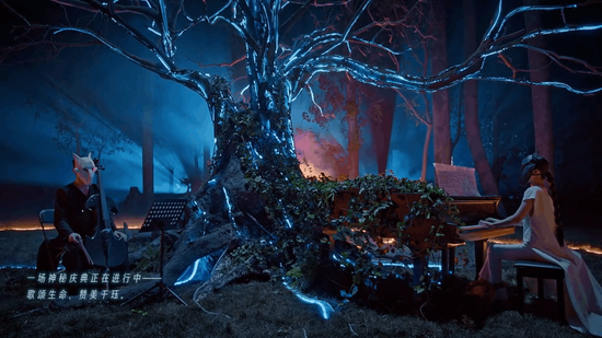 从开篇的”新世界”到”对峙”,经过”穿梭”到最后的”赞歌”,跟随着一个“玩家“的视角,4个篇章共12段组曲逐一呈现,带领所有玩家重新感受英雄联盟的音乐海洋。在”新世界”篇章中,玩家推开大门,幽静的妮蔻森林中,萦绕着歌者轻柔的吟唱与乐团舒缓的演奏声,从天而降的艾菲瀑布下方,扮演霞、洛的舞者用曼妙的舞姿,重现了他们的爱情故事。