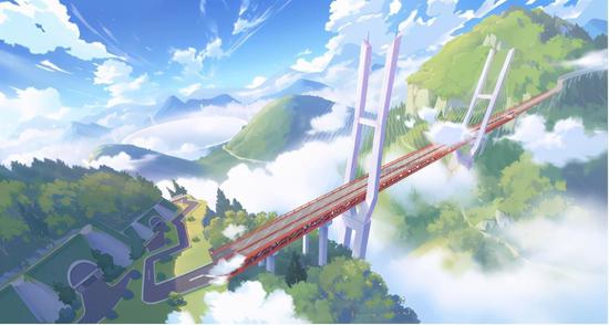 科技赛道的起点设立在北盘江大桥之上,腾云驾雾的桥面为起跑增添了几分刺激感。驶出不久后,世界第一高桥“北盘江大桥”、硕大的“中国天眼”FAST映入眼帘,紧接着是飞檐四起的甲秀楼,再穿过木质支柱的长廊进入三线博物馆。最后,通过梯田、樱花林路段,便来到终点处著名的遵义会议旧址。游戏中加入了三段轨道、连续三段飞跃台等玩法,让玩家在飞驰中感受贵州发展的日新月异。