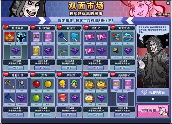 劲爆的双面市场来了!在夜市中玩家消耗点券时可以获得消费金额10%的钻石,然后可以去兑换三国徽记卡、笑脸等极品装饰道具,还可以用点券去黑市购买更好的商品,最多可以获得5折优惠!在黑市玩家购买道具可以获得钻石,钻石还可以在夜市中兑换超值商品,越买越优惠!赶快来买买买吧,福利满满!