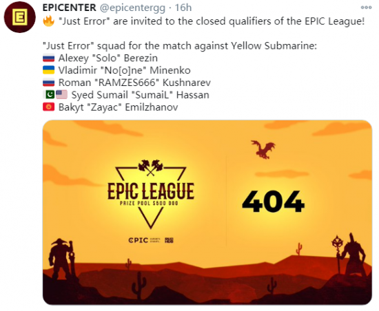昨天晚上,Epic联赛主办方宣布邀请Just Error战队参加附加赛,Just Error正是之前外媒爆料的Sumail组建的新队,其战队选手完全和爆料的一致。