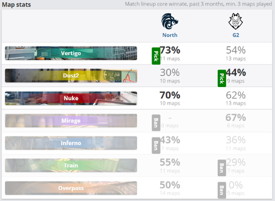 首先为T的G2进攻十分流畅,以4-0开局,第五局G2放慢了进攻节奏,被North一波反刷,之后的North乘着经济优势连拿8分第十二局中更是出现了G2三人存活放包却被North硬生生拆掉的场景,次局G2吸取教训终于在连输八分后拿下一分,使上半场North以10-5领先G2。换边之后,G2的手枪没有让人失望,且在Vertigo的防守中也更加有配合,连拿7分反超,而后North终于开张拿下关键长枪局,使G2陷入eco,比分持续胶着,但还是North率先拿下赛点,经济劣势的G2终究没有刚过North,G2最终以14-16输给North。