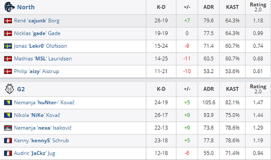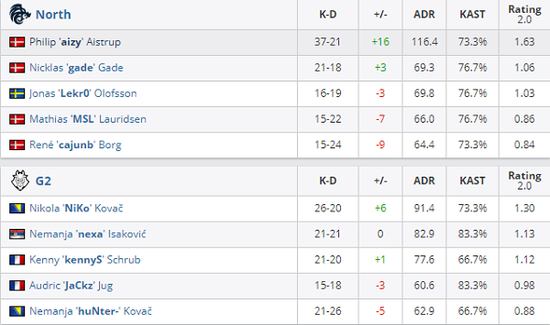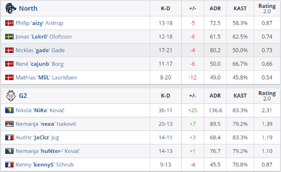 开局North在拿下三分,第四局在拿足信息的情况下,反而没有顶住G2的一波进攻,使G2连拿3分,比分再次胶着起来,但在North拿下第四分后,G2连拿五分,最终上半场G2以9-6领先。换边之后,尼公子手枪局1v4残局,极限精准打掉3个,最终仍被补掉,North惊险拿下手枪局,但下半场G2在CT边优势连续拿分,在经济上也同样给足North压力,在G2率先拿下赛点后,North顶住三个赛点,到了全枪全弹长枪局,G2顺利拿下最后一把以16-12拿下Nuke。