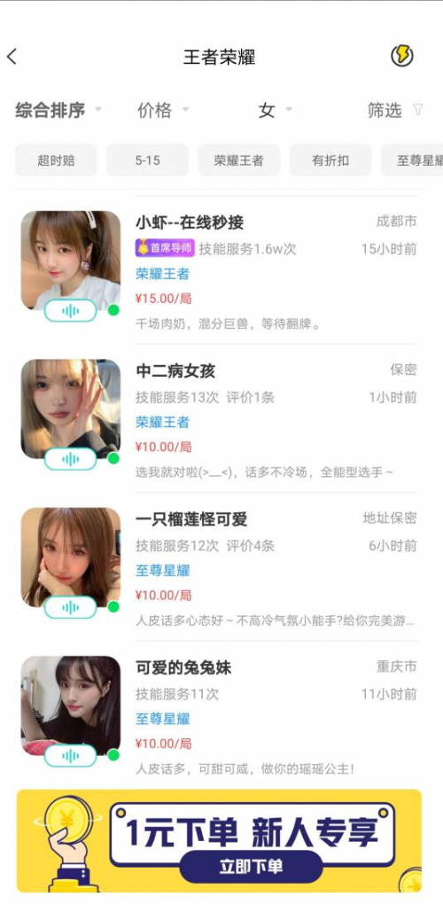 此外,一派语音也不乏高颜值、高段位的女性陪练。过去游戏似乎只是男性娱乐方式的代名词,但随着电竞的快速发展和游戏种类的丰富,越来越多的女性玩家加入电竞玩家的行列。根据荷兰统计数据Newzoo的统计,女性玩家的数量已经超过了10亿, 占到了所有玩家数量的46%。而一派语音吸引了大批女性陪玩入驻,不仅让她们展示自己的游戏、唱歌、声优等技能,也为她们提供一个增加收入的机会,更展现出当下女性更多元化的职业发展。