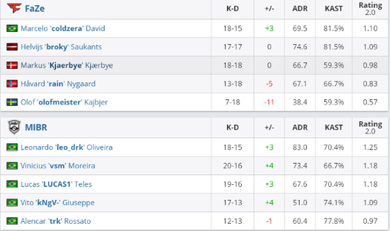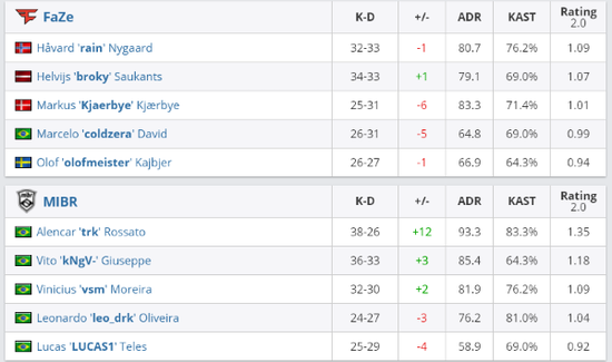 首图是MIBR选择的Nuke。在自己的选图MIBR没能在上半场进攻方取得优势,虽然kNgV-三杀帮助队伍手枪局取胜,但是此后MIBR突然“全线崩溃”再难得一分,FaZe五人齐心协力拿到11-2的“梦幻比分”。或许由于trk在半场最后两局枪毙VSM两次“祭天”,MIBR再挽回两分,上半场4-11大比分落后。转入下半场,FaZe拿到手枪局后T方两连胜再扩大优势,MIBR极其顽强,主狙kNgV的发力再加上抓住FaZe的失误MIBR连追11分,比赛意外地被拖入加时。双方鏖战至第三个加时,最终MIBR惊天大逆袭22-20翻盘FaZe。