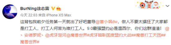就在近日,虎牙知名主播董小飒发布微博“炫耀”自己在魔兽世界中的34格背包,同时@了其他三名主播:安德罗妮、Burning徐志雷、楚河“宣战”。顺着这条微博小编才了解到,原来是虎牙发起了暗影国度盟约大战活动,而这四位主播已被在各路网友的调侃之下被迫成为了暗影国度的“打工天团”。