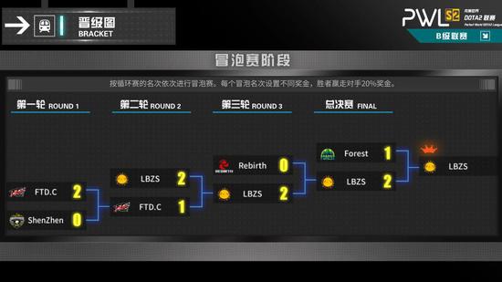 前期双方互有来回,整体上皆以发育为主。中期LBZS利用团战优势,建立起了良好的进攻节奏,在双方人头相差无几的情况下,20分钟经济领先对手高达8K。25分钟Forest推进中塔,LBZS在少人的情况下3人主动迎战满员的对手,经过一番拉扯接连斩杀对手4人,LBZS旋即控盾,至此LBZS彻底掌握战场的主导权。29分钟Forest意图动手虚空假面,虚空假面开启黑皇杖果断反打,接连敲死痛苦女王以及幽鬼,最终随着冥界亚龙被击杀后,Forest敲出GG。恭喜LBZS与Forest血战三场后以2:1斩获PWL联赛S2赛季B级联赛冠军,并且将70400元的冠军奖金纳入囊中!