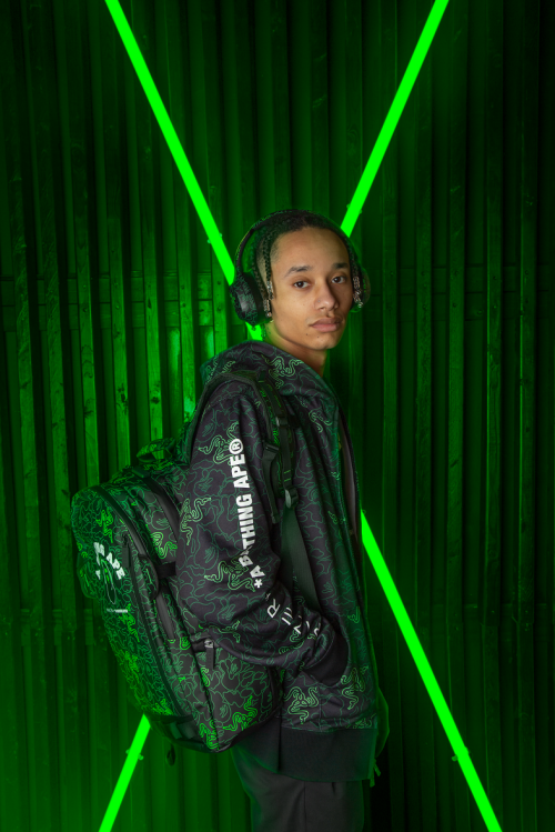本次共发布了三款服饰产品,分别是T恤、外套以及背包。三款产品都延续了与外设相同的设计主题「城市丛林」:以雷蛇和BAPE的logo线条变化为主,主色调为经典雷蛇绿,加上专为其设计的“特别版”LOGO,无处不彰显着其纯正的电竞血统和潮流风格。