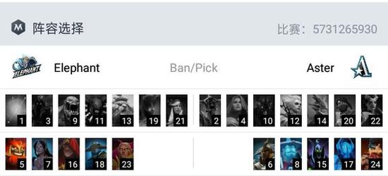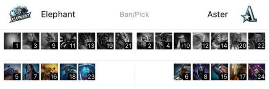 Elephant天辉,Aster夜魇。Elephant选出斯温蓝猫酒仙的三核阵容,辅助是白虎和蓝胖。Aster则是选出剑圣戴泽猛犸的三核,辅助是拉比克和陈。