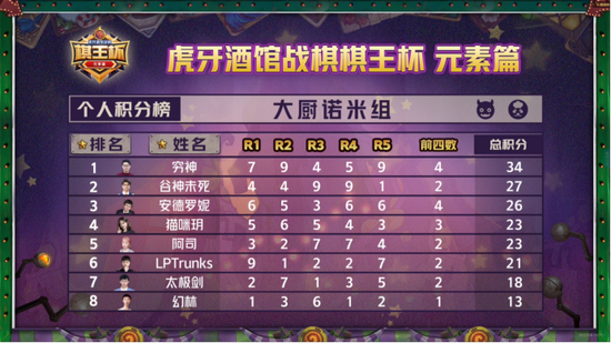 大厨诺米组的五局对抗结束后,穷神以34的积分遥遥领先,谷神、安德罗妮分别位居2、3名,而在赛前被广大水友寄予厚望的太极剑、幻林两位选手则位居榜尾,希望二位在后续的赛事中会有更好的表现。