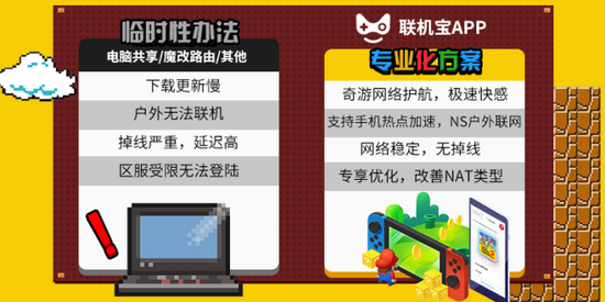 使用主机加速器是快速有效的解决办法,笔者作为主机重度爱好者一直在使用奇游联机宝进行主机加速,奇游最新出的联机宝3Pro,拥有5G千兆端口,支持NS下载加速,超低延迟极速匹配不掉线。这个时候肯定有人会问,那在户外或者出门聚会也要带着联机宝才可以加速么?