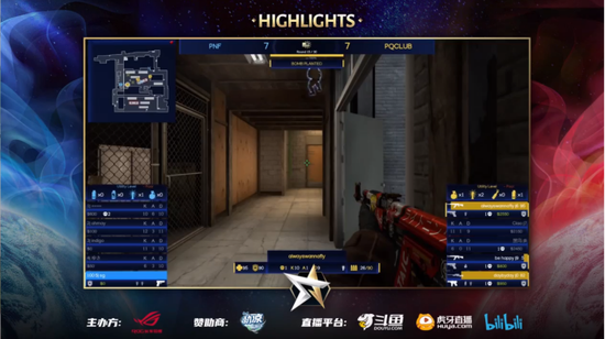 PQ随即变换战术 ,侵略如火的快节奏进攻没有再给PNF太多机会,率先来到赛点局。赛点局中PQ的always残局一打二,手持大狙先打掉藏在水下的一员,颇有种冲锋狙的风范。always准备在B点埋包时,听见了敌方sg的脚步声,当机立断选择转A,安放炸弹之后楼梯口架点,完美预瞄收下人头,将图一比分定格在PQ16-10PNF。