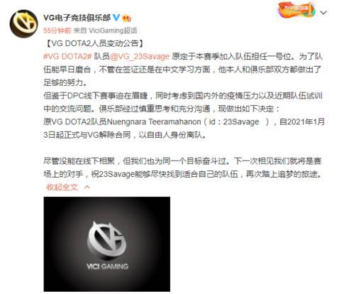 原VG DOTA2队员Nuengnara Teeramahanon(id:23Savage ),自2021年1月3日起正式与VG解除合同,以自由人身份离队。