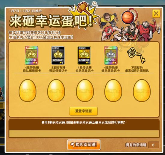 活动规则:玩家可以通过购买幸运锤用于砸幸运蛋。砸开幸运蛋有概率获得各种礼物。幸运条满了之后会出现特殊幸运蛋,更高概率获得珍稀道具。