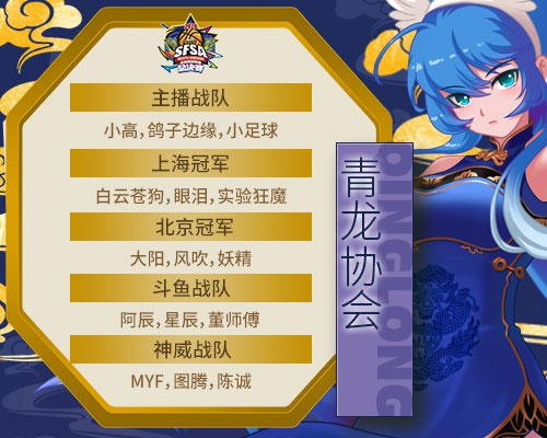 青龙协会主播战队队员为小高、鸽子边缘、小足球,FSPL总冠军斗鱼战队是SFSA总冠军大热门,神威战队6位选手齐聚青龙协会,不知道能否用团结的力量在阵营战胜出呢?