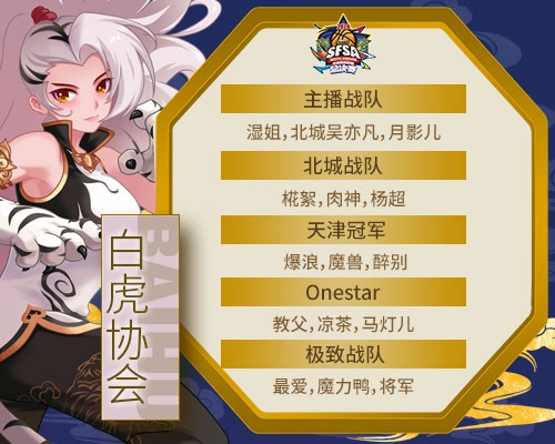 白虎协会主播战队队员为湿姐、北城吴亦凡、月影儿,白虎协会4支战队都来自4区,可见其强大的整体实力,不能小看其中任何一支战队,拥有Onestar强劲的得分能力以及经验老道的极致战队以及北城战队,还有新秀爆浪所在的天津冠军。