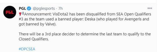 夺得东南亚第三个通过海选晋级A级联赛资格的VISDota战队被赛事方PGL取消了参赛资格。PGL表示,队伍中出现了前Avengerls的第五名选手Deska,他因为假赛被V社永久禁赛。