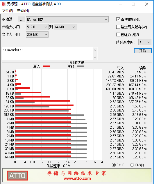 ATTO Disk Benchmark软件测试能够真实反映固态硬盘在不同大小文档时的最大读写性能,揽慧SSD在测试中,最大读速达到了3.31GB/s,最大写入速度达到2.69GB/s,这样的表现已经足够满足高端用户的使用需求。