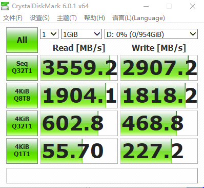 在CrystalDiskMark测试中,揽慧SSD跑出了3559.2MB/s连续读取速度,以及2907.2MB/s连续写入速度,充分展示了揽慧SSD的强悍性能。