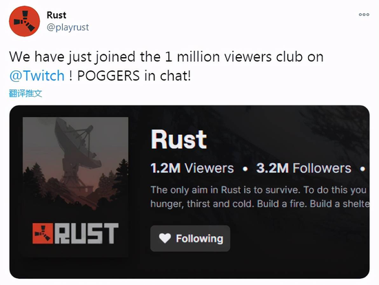 2020年底,海外的圣诞节假期期间,《Rust》成为“天选之子”。大量Twitch主播的突然涌入,为游戏带来了巨大流量。《Rust》在Twitch平台上的直播观看量连续数日排名第一。1月4日,游戏在Twitch上的观看人数突破120万。《Rust》官方为此专门发了推文,庆祝加入“Twitch百万观众俱乐部”,并在Blog中称“我们短暂地站在了聚光灯下”。