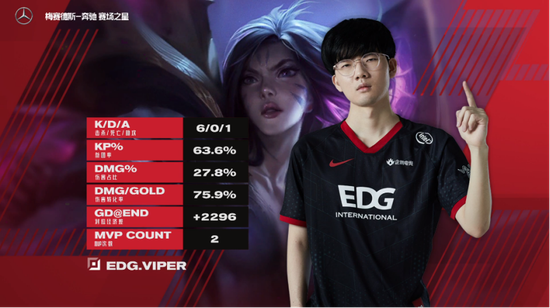 EDG此次获胜的最大功臣莫过于最新引进的AD选手Viper了,他在这一场BO3较量中面对S9冠军AD选手Lwx的强势来袭下成功稳住压力,无论是首局的对线劣势的卡莎还是决胜局惨遭针对的月男,Viper都展示出了强大的发育能力,32分钟400刀的恐怖补刀数直接神装参团接管比赛。最为关键的还是属于远古龙争夺战了,没有惩戒的Vpier竟然在S9FMVP小天的手上完成了二度抢龙的壮举。