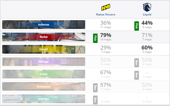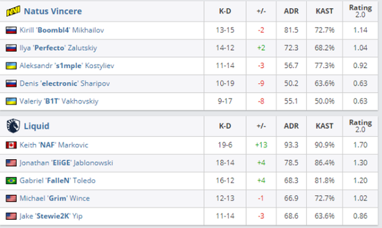 首张地图来到Liquid选择的Inferno,先CT方的Natus Vincere凭借手枪局的胜利拿到2-0的开局,但在双方起出长枪后,Liquid变得势不可挡。NAF火力全开,新加入的FalleN也在起出大狙后打出了不错的表现,Liquid成功在半场拿到12分。换边后的Natus Vincere扳回几分,但也无力回天,最终以6-16的比分输掉第一张地图。