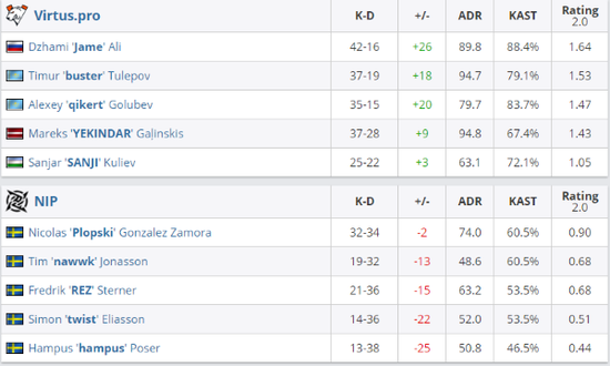 VP是一只有无穷可能的战队,队内五人的个人能力都是世界顶级水平,图一图二都是轻取NIP。反观NIP依然处于低谷,主狙nawwk以及指挥hampus的状态起伏导致整体队伍陷入低迷,可能NIP也需要一些改变,比如六人阵容的尝试。