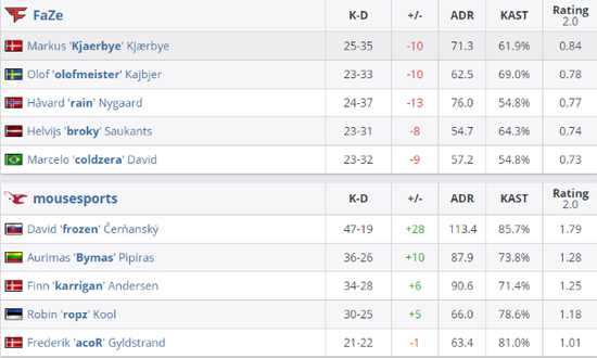 让FaZe粉难过的是即使随着队伍磨合Kjaerbye场上的个人竞技状态越来越好,队伍里还是缺少领导整个团队的灵魂人物,这导致FaZe无论是进攻还是防守都或多或少的有些混乱,几位老将的状态起伏也是令人担忧的一点。MOUZ引入acoR的第一场比赛,acoR虽然整体战绩不够亮眼,但也有一些精彩操作。而Bymas和frozen两人的出色表现则是很大程度的分担了ropz的压力,图一图二分别由两人取得最高rating。对MOUZ而言现在需要的同样是时间,还有更多的比赛。