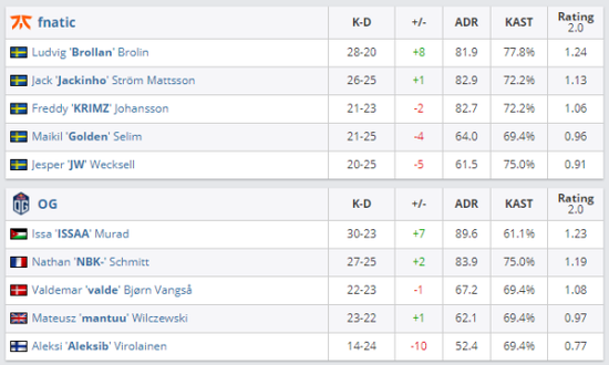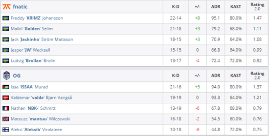 无论队友发挥如何,KRIMZ永远是fnatic队内最稳定的火力点,即使是面对手感绝佳的ISSAA,他的发挥也毫不逊色。在三张地图上,瑞典大光头打出了83.8的ADR,rating高达1.12。