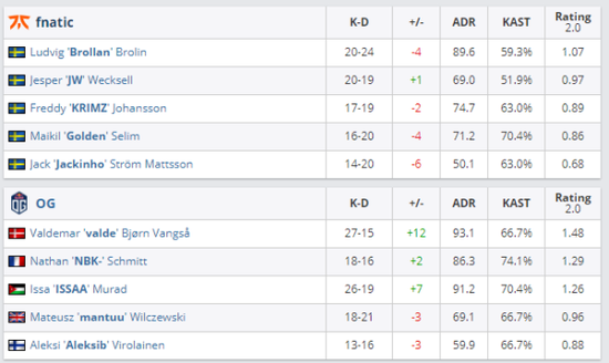 决胜局Inferno,OG先做进攻方。在输掉手枪局后,OG丝毫不慌,在第一个长枪局依靠valde的三杀直接翻盘。ISSAA延续了前两张地图的火热手感,带领队伍在上半场攻下9分。换边之后,来到了fnatic的表演时间,Golden在Inferno上的指挥功力表现得淋漓尽致,很快带领队伍拿到赛点,无奈ISSAA的枪法太过强硬,比赛还是被拖进了加时。最终,fnatic全员发挥,以19-16的比分赢下比赛。
