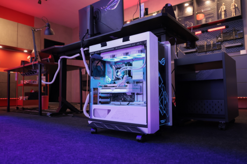 首先,在这间还原Tony大叔日常娱乐、办公、摄影的高端电竞房间中,高端豪华的电竞装备可谓应有尽有。作为整个电竞空间的核心装备——ROG全家桶更是采用了最新发布的ROG MAXIMUS XIII HERO(简称ROG M13H)主板,再加上ROG STRIX GeForce RTX™ 3090、ROG STRIX LC Ⅱ 280 ARGB飞龙二代一体式水冷散热器、ROG STRIX XF120风神风扇、ROG STRIX 雷鹰1000W金牌全模组电源、ROG STRIX HELIOS太阳神机箱等高性能硬件,为玩家们带来强悍游戏体验。
