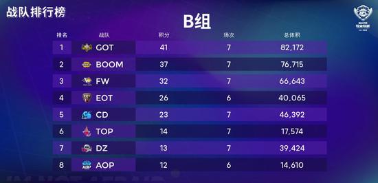 回看本次BPL季前赛首轮小组赛结果,B组的GOT战队以41积分,82172的总体积暂时领先,剩下的队伍积分呈阶梯形式排列,各个队伍之间分数差值较小。而A组中,由于赛程进度较快,已进行的场次较多,各个队伍之间的分差被进一步拉大,其中VLK战队以97积分、190070总体积的好成绩一骑绝尘暂列小组第一。经过第一轮的比拼,出线队伍的名单已初现端倪。