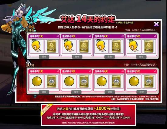 每天完成一场:+100%经验值,完成两场:+200%经验......完成10场:+1000%