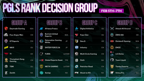 在2月5日至2月7日三天内,参加PGI.S的全部32支参赛战队通过随机抽签,分为4小组,每小组8支战队,进行为期三天每天8场、共24场的赛前排位赛(Rank Decision),最终根据各战队一轮比赛总积分排名,决定第一周周中生存战的参赛名额。排位赛最终排名前16名队伍和后16名队伍,将分别以不同形式参与首周周赛(Weekly Series)。代表PCL赛区参加本次PGI.S的六支战队中,4AM以及TSG共同位于A组,iFTY、MCG以及PERO战队共同位于C组,Tianba则位于D组。32支战队具体分组情况如下: