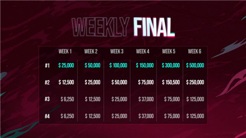 周末决赛依照PUBG电竞常规积分赛制进行,10场比赛过后,最终积分排名前四队伍,将赢得丰厚奖金。6轮周末决赛,从第一周5万美元,到最后一周100万美元,每轮奖金数额逐步增加。对于每一个参赛队伍来说,即便在开赛前期的战绩不如人意,在后期厚积薄发奋起追击依旧有机会拿到高额奖金。