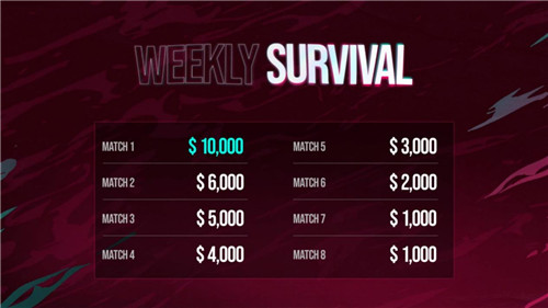 每周16场周中生存赛中,前8场比赛吃鸡战队将获得不等额奖金,奖金数额依次递减,第9-16场比赛吃鸡队伍,也将直通当周周末决赛,但不会获得额外奖金。