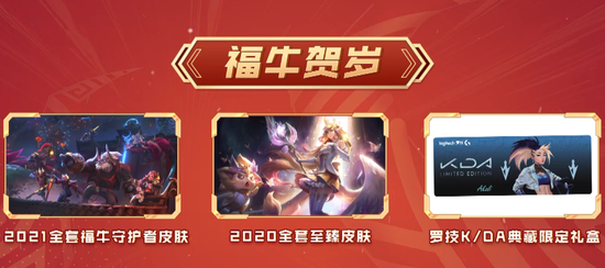 互动福利包含:全套福牛守护者皮肤、全套至臻皮肤、罗技K/DA典藏限定礼盒(包含K/DA联名鼠标、K/DA定制鼠标垫)、Q币、微信红包封面等