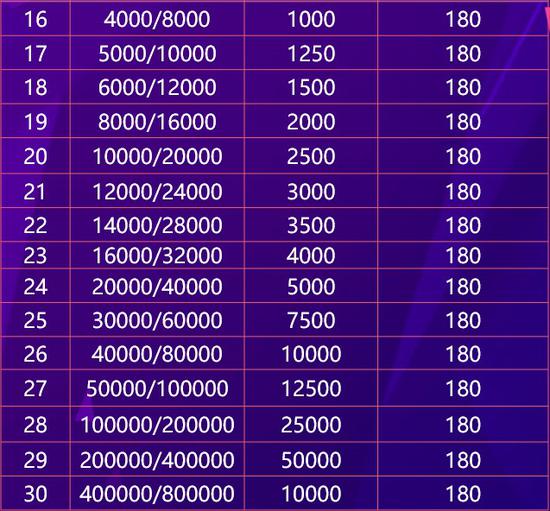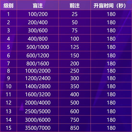 比赛赛制:WCAA国际竞技扑克新春赛采用MTT模式,每名玩家初始携带20000比赛分入场。盲注级别及涨盲时间如下。