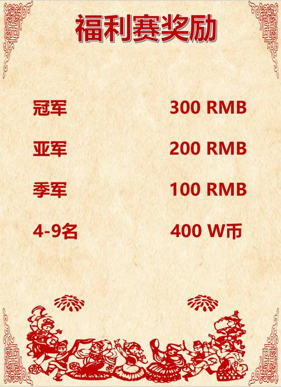 比赛赛制:WCAA粉丝新春福利赛将采用积分淘汰制决出排名,每场比赛共11轮比赛,每轮比赛1局牌,晋级名额为N-246-198-156-120-81-51-30-18-9-3-1,前9名玩家获得奖励。