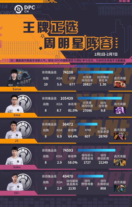 DPC中国赛区第三周比赛已经结束,畅快淋漓的电竞春晚看得可否过瘾?而在本周比赛结束后,2月1日-2月7日的王牌正选周明星阵容也已出炉。S级联赛中,本周上榜的选手有四位都来自iG战队,最近的战绩以及选手在比赛中的表现都是他们吸粉的原因。Elephant战队的Eurus则因本周的表现强势上榜,而他也和iG这支队伍有着不浅的渊源。