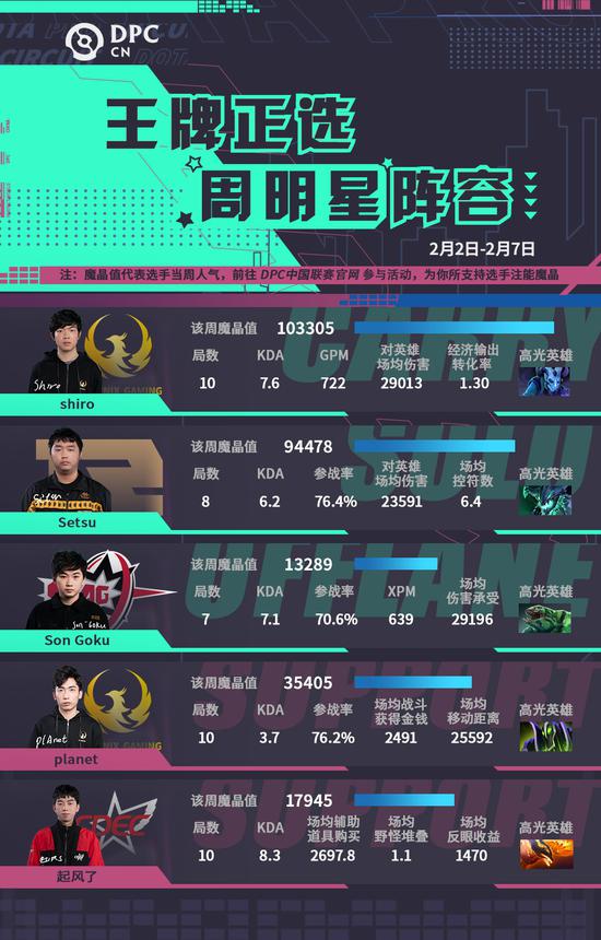 而在A级联赛中,Phoenix.shiro、RNG.Setsu、SAG.Son Goku、Phoenix.planet和CDEC.起风了组成了周明星阵容。Phoenix.shiro的GPM高居所有选手第一,场均英雄伤害和总击杀则是联赛第二;Setsu是我们非常熟悉的选手了,76.4%的参战率冠绝所有选手,殁境神蚀者被迫三杀的镜头令人印象深刻;SAG目前暂居A级联赛榜首,Son Goku的发挥至关重要,他的多项数据都是位居三号位之首,KDA也是非常不错;planet和起风了两位选手则是在辅助位置上有着亮眼表现,KDA、助攻等数据都从一定程度上体现了他们的实力。