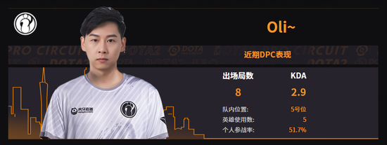 Oli在近期比赛中,操刀的神谕者、萨尔等英雄都是发挥不俗,救援、分隔战场等都做的非常不错。比赛中,他大量承担了队伍视野、辅助道具等方面的任务,尽职尽责;同时他也有着良好的对线表现,核心的顺畅发育离不开他堆叠野怪、对线压制等方面的贡献。5号位往往是比赛中集火的对象之一,而Oli~在承担了团队重任的情况下,场均阵亡次数是所有5号位最少的,这也体现了他对局势的出色理解和团战良好的站位。